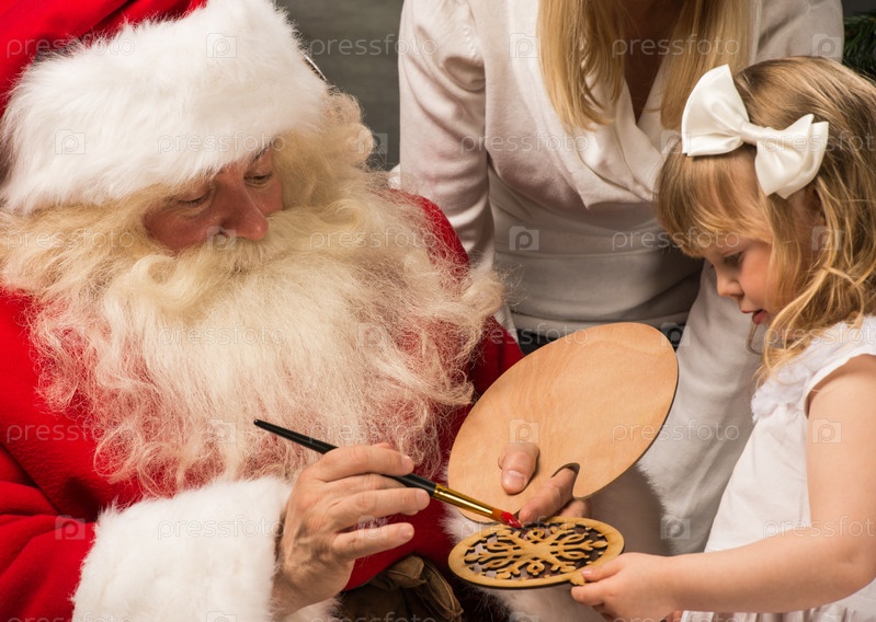 Санта-Клаус, девочка и ее мать раскаршивают рождественские украшения