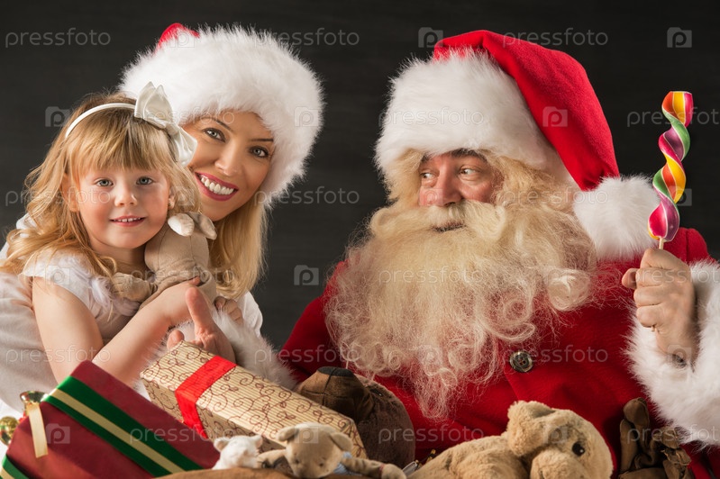 Санта-Клаус, маленькая девочка и ее мать с подарками