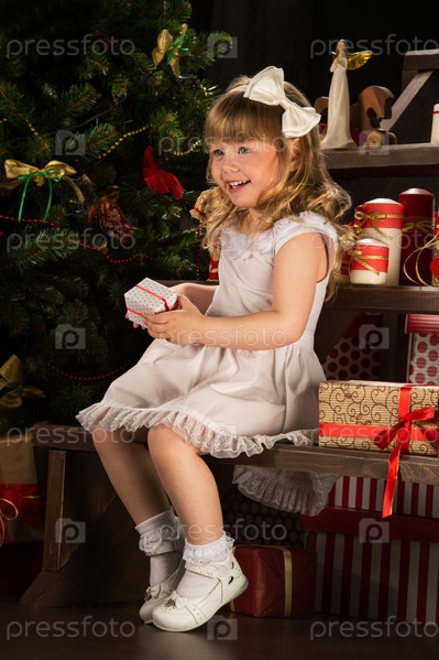 Счастливый маленькая девочка с рождественским подарком