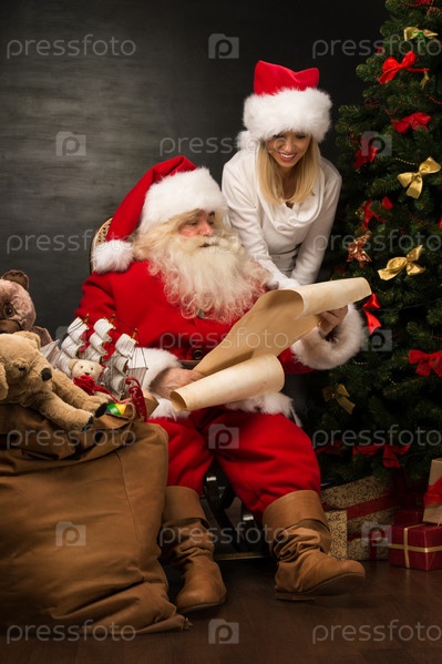 Счастливый Санта-Клаус с помощником читают письмо или список пожеланий