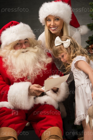 Санта-Клаус с милой девочкой и ее матерью читают письмо