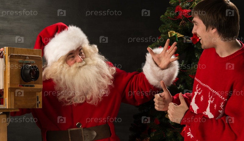 Санта-Клаус фотографирует веселого мужчину старым фотоаппаратом возле елки