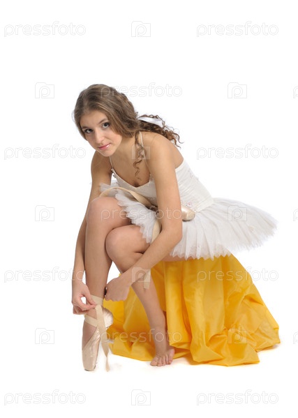 Девушка-балерина завязывает пуанты на белом фоне