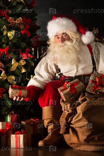 Санта кладет подарок под елку в темной комнате