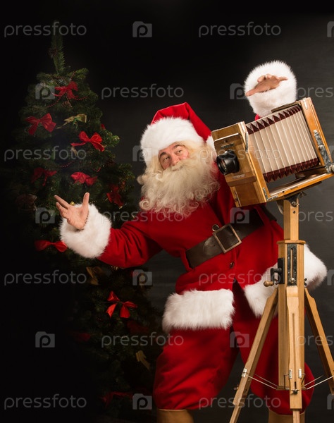 Санта-Клаус фотографирует старой деревянной фотокамерой