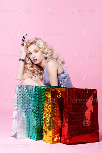 Красивая блондинка с кредитной картой в руках сидит возле пакетов с покупками