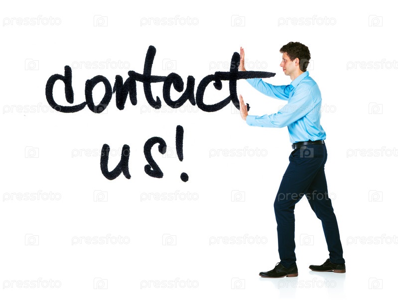 Молодой бизнесмен с баннером 'Свяжитесь с нами' на белом фоне