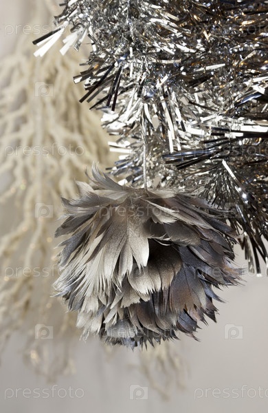 Серебристая новогодняя игрушка крупным планом