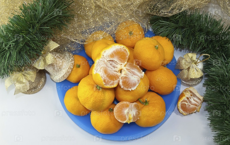 Новогоднее блюдо с мандаринами и елочными игрушками крупным планом