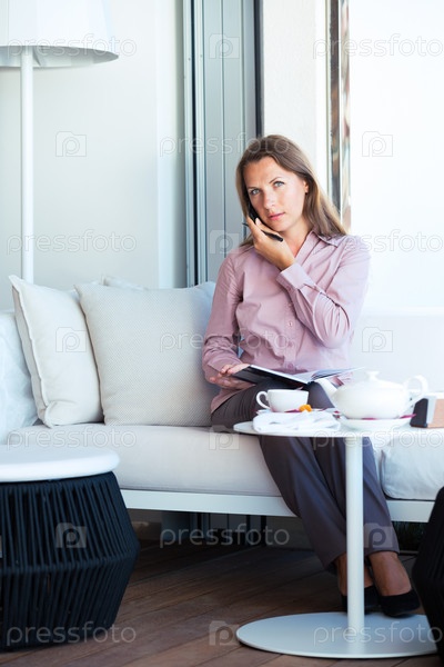 Бизнес-леди разговаривает по телефону и пишет в ежедневнике