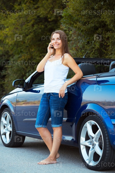 Улыбающаяся европейская женщина разговаривает по телефону в кабриолете