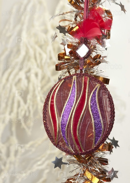 Красивая разноцветная висящая елочная игрушка крупным планом