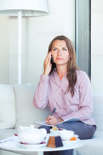 Бизнес-леди разговаривает по телефону и пишет в ежедневнике