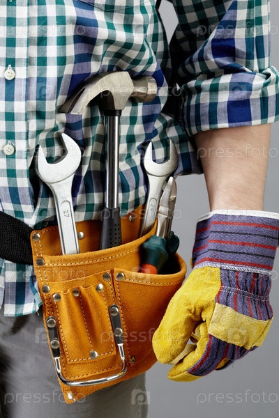Инструменты для ремонта на поясе у строителя