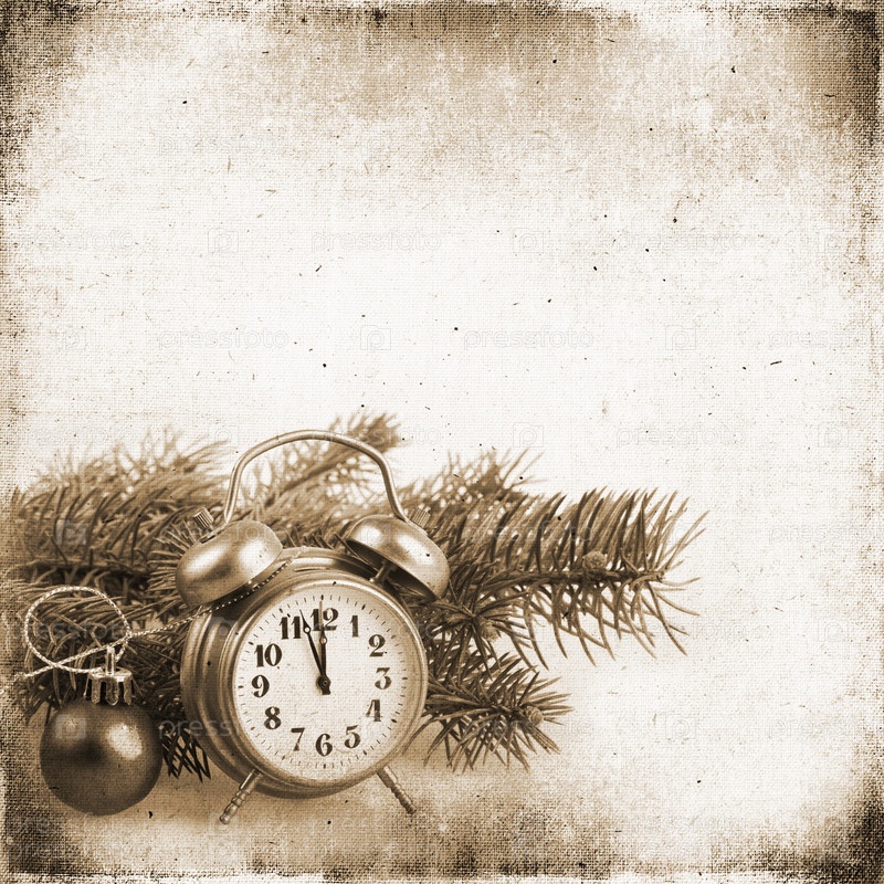 Рождественская елка и часы на фоне старой текстурированной ткани