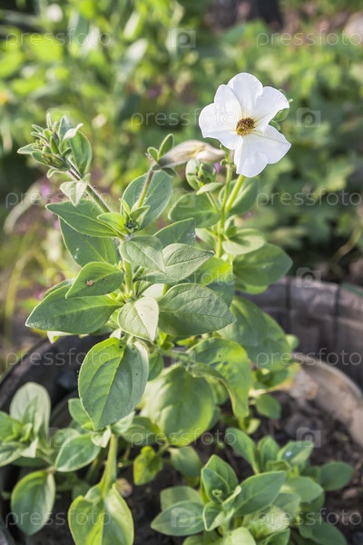 Белая петуния в деревянном горшке