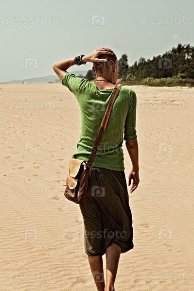 Человек идет по песчаному пляжу