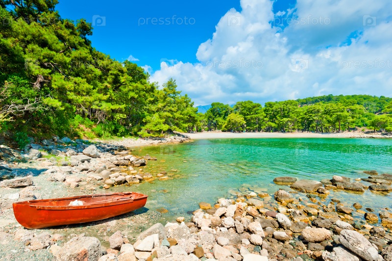 Каменистый берег с соснами и лодка