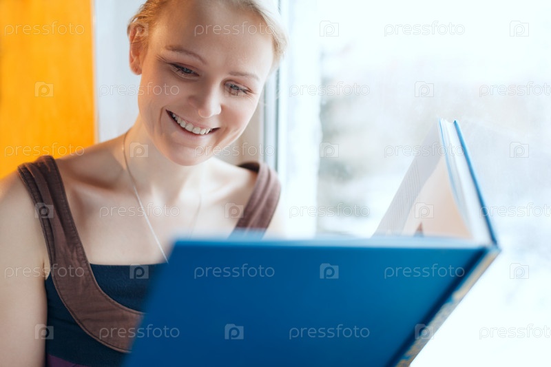 Молодая женщина улыбается, читая книгу