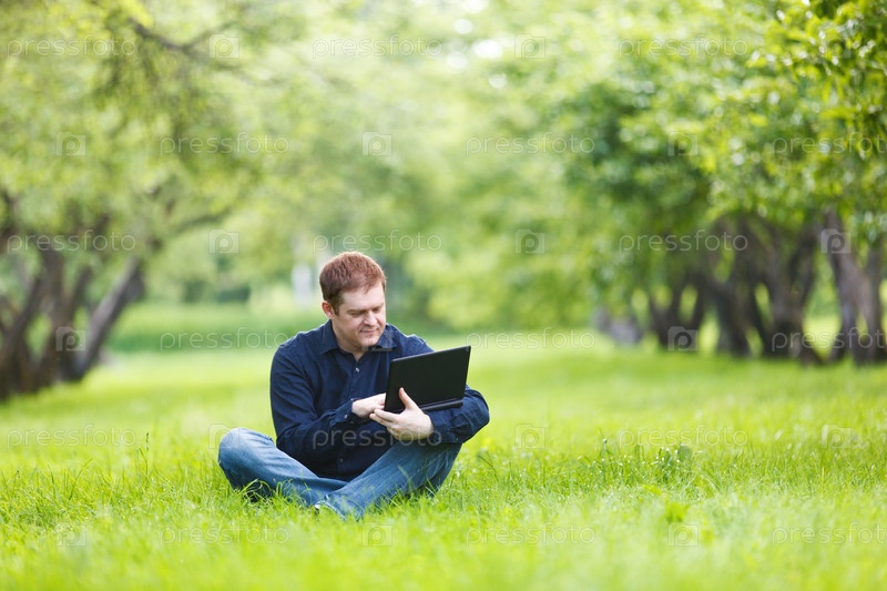 Мужчина работает на ноутбуке в парке