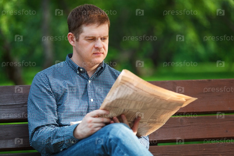 Человек читает газету на скамейке в парке
