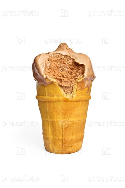 Шоколадное мороженое в вафельном стаканчике на белом фоне