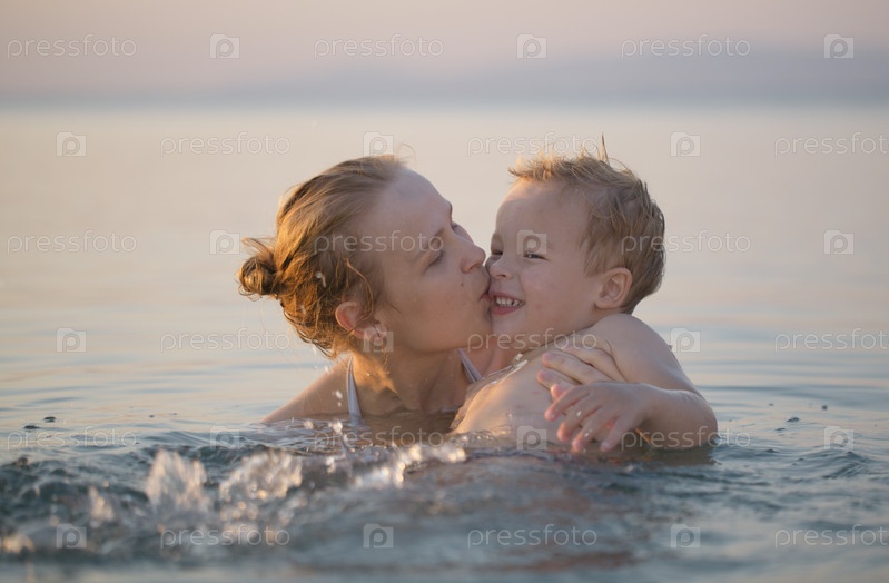 Мать играет с сыном в море