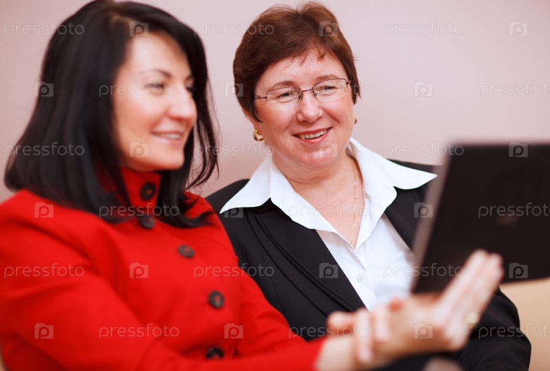 Две женщины совместно пользуются планшетным компьютером