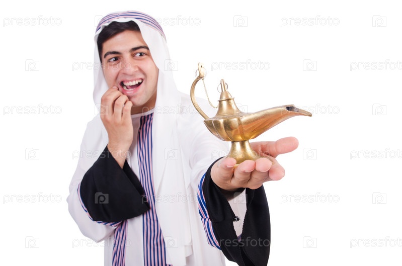 Арабский мужчина с лампой, изолированный на белом