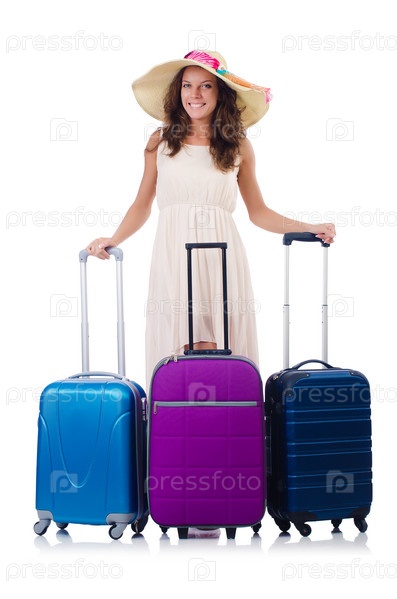 Женщина собирается на летние каникулы, изолированная на белом фоне