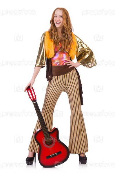Молодая девушка с гитарой на белом фоне