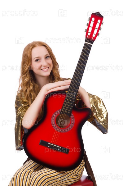 Молодая девушка с гитарой на белом фоне