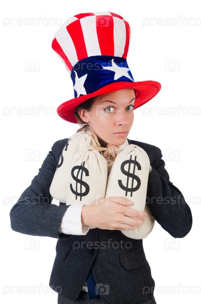 Предприниматель с мешками денег на белом фоне