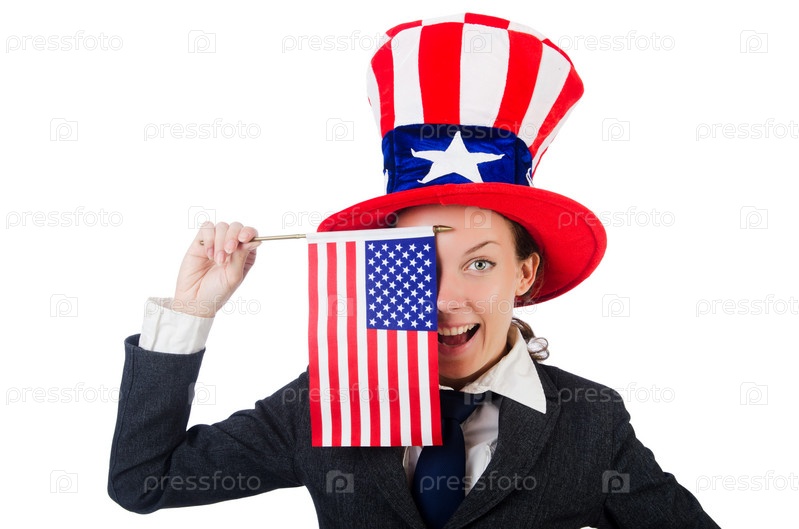 Молодая женщина с американскими символами на белом фоне