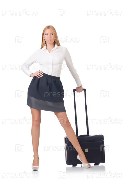 Женщина с чемоданом на белом фоне