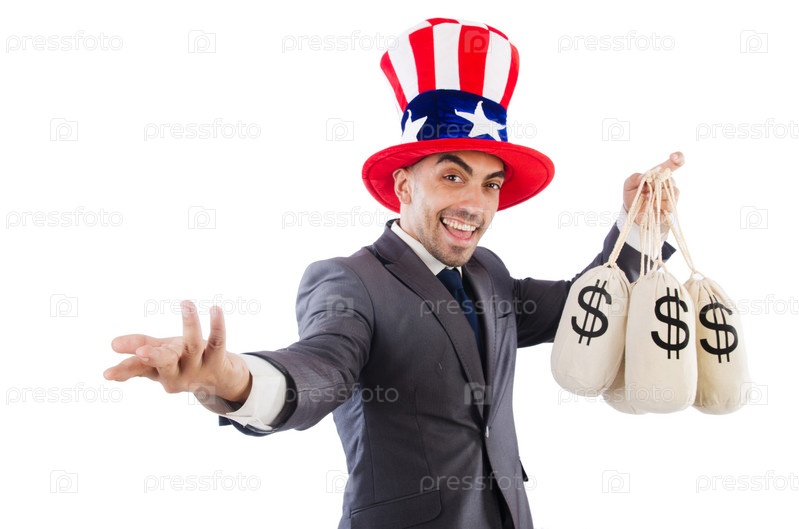 Человек с долларами на белом фоне