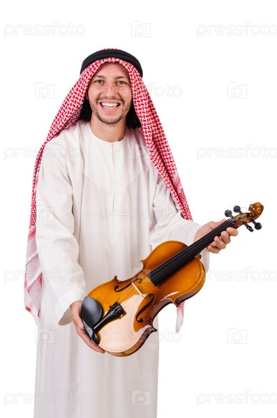 Арабский мужчина со скрипкой на белом фоне