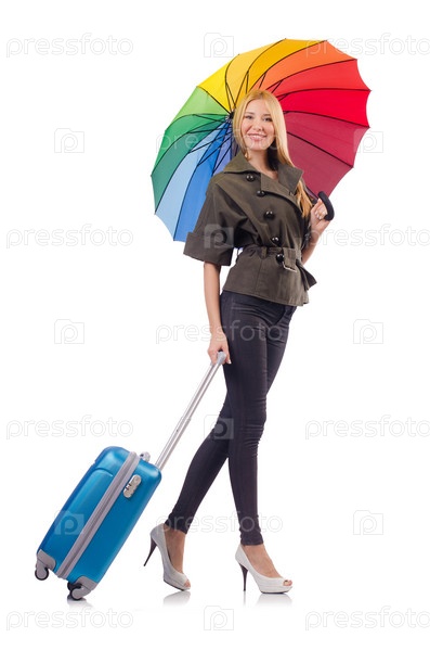 Женщина с чемоданом на белом фоне