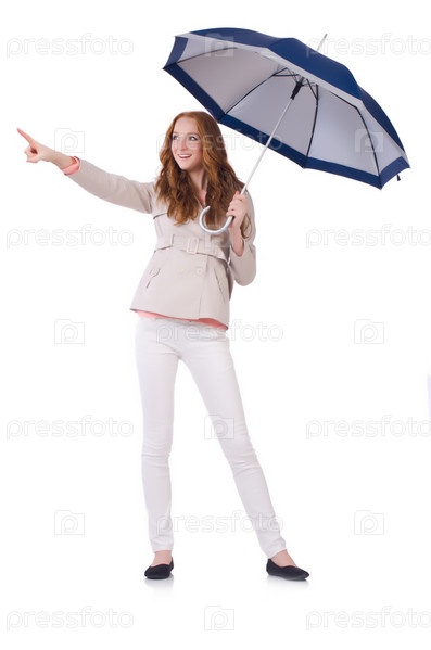 Молодая женщина с зонтиком на белом фоне