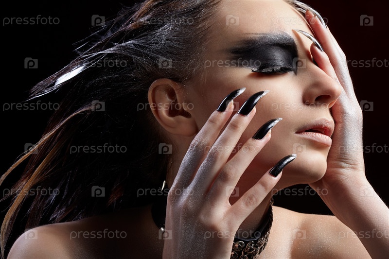 Портрет модели с креативным макияжем в стиле хищной птицы и черными когтями