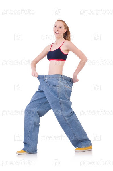 Женщина с большими джинсами в концепции диеты