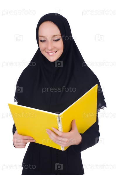 Молодая мусульманская студентка с книгами на белом фоне