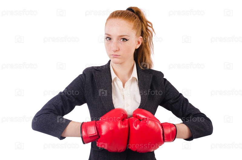 Женщина в боксерских перчатках, изолированная на белом