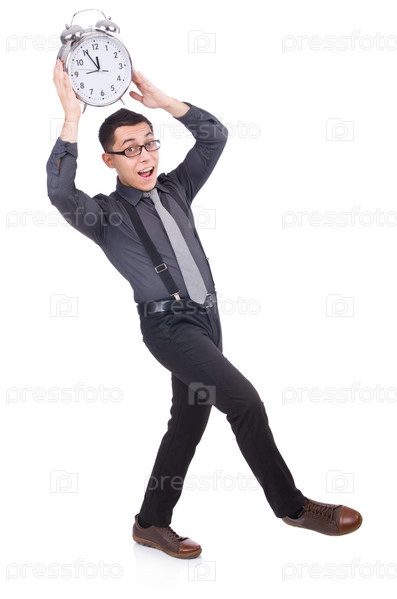 Смешной бизнесмен с часами, изолированный на белом