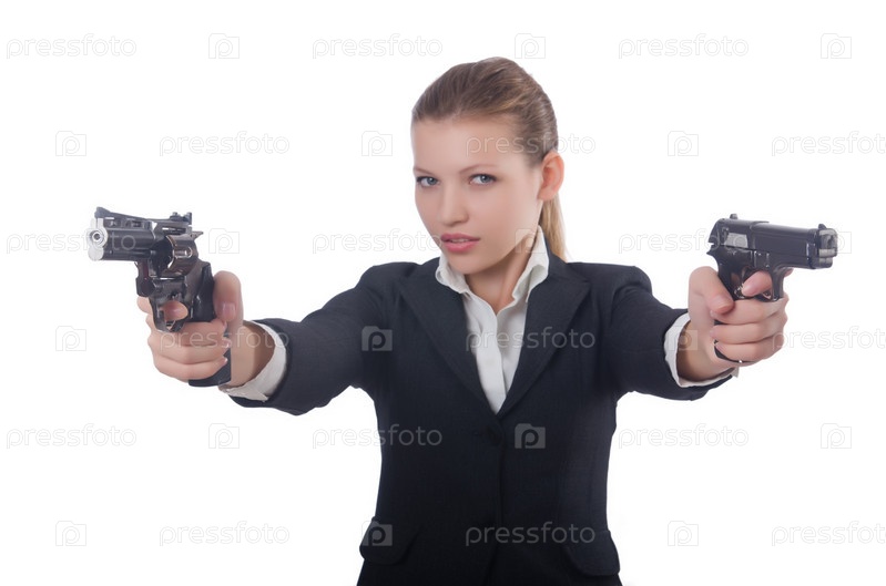 Бизнес-леди с пистолетом на белом фоне