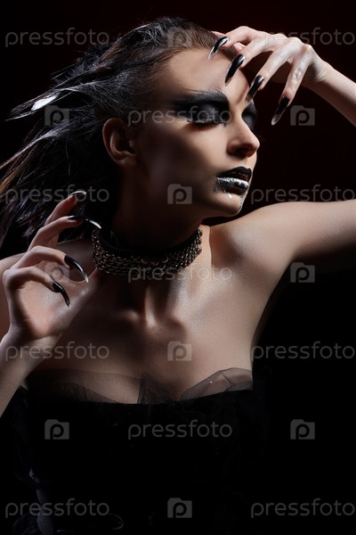 Портрет модели с фантазийным макияжем в стиле хищной птицы и черными когтями
