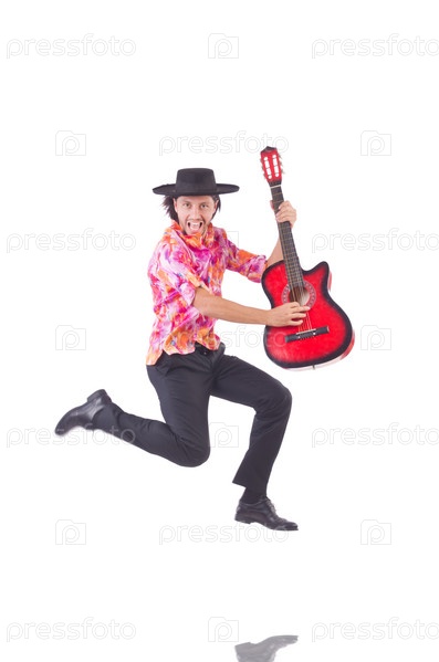 Человек с гитарой, изолированный на белом