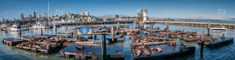 Панорама, морские львы на пирсе 39, панорамный вид на Сан-Франциско, США Калифорния