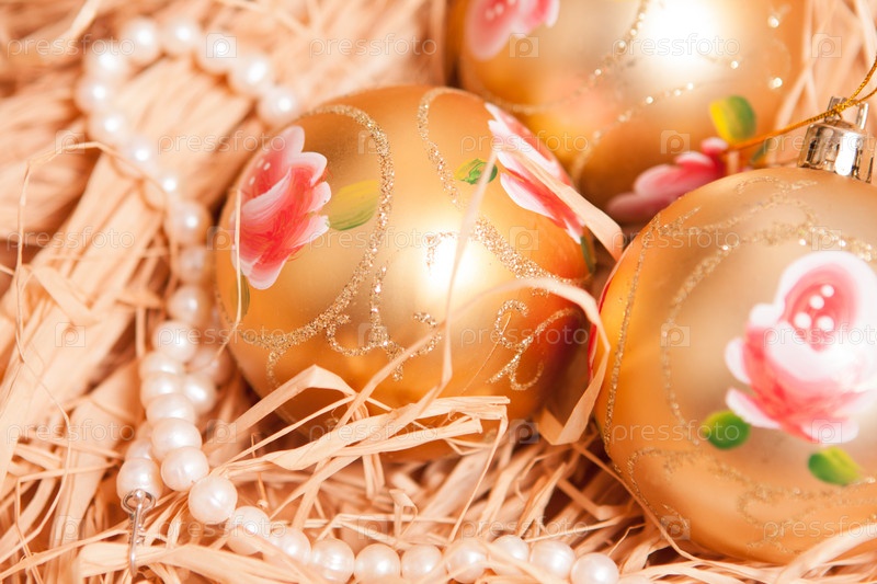 Новогодний фон с игрушками и соломой