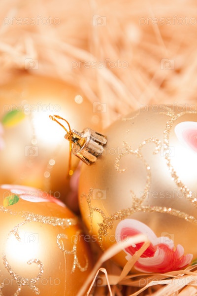 Новогодний фон с игрушками и соломой